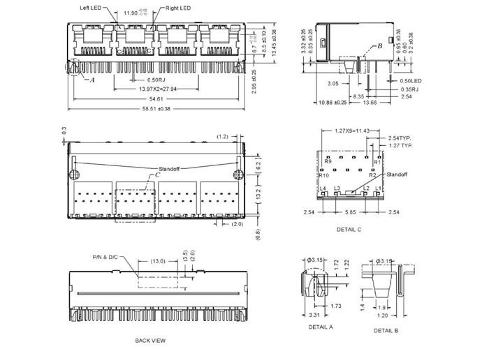 | General | Product Type | 1×4 Port RJ45 Modular Jack with Integrated Magnetics (Tab-Up) |